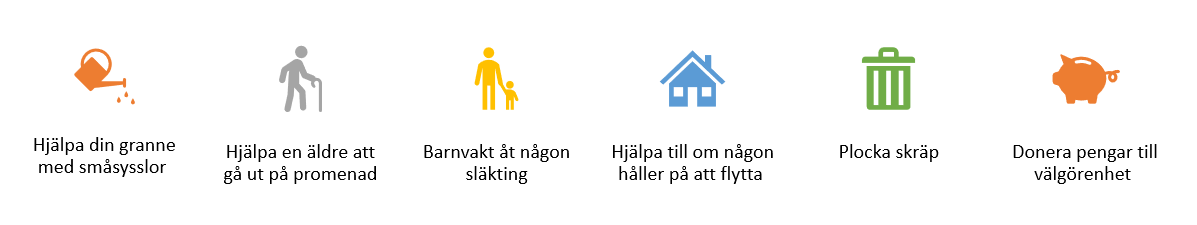 Det kan handla om att hjälpa din granne, plocka skräp, besöka äldre på ett äldreboende eller