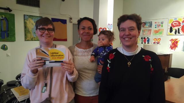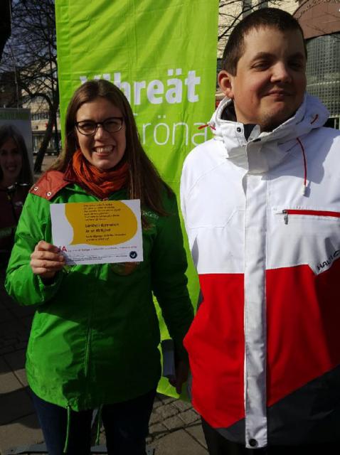Tuuli Hirvilammi (gröna) stöder vår kampanj om lättläst. Med på bilden är även Johan Lustig från Steg för Steg.Läs mera »