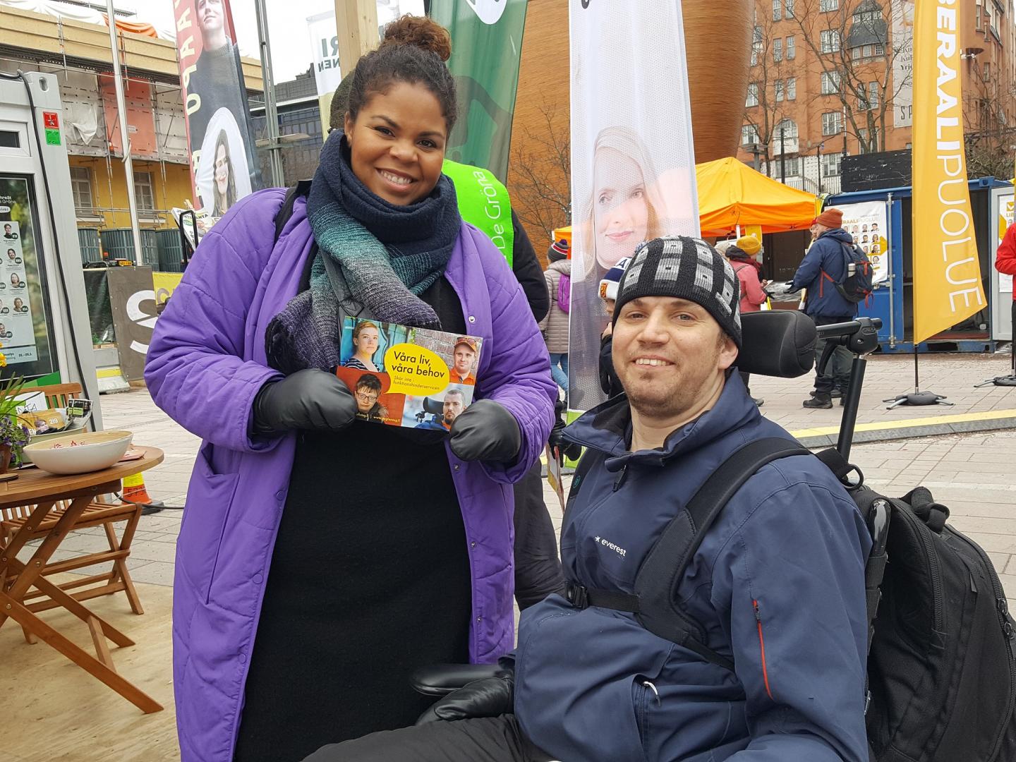Fatim Diarra (Gröna) stöder vår kampanj om att inte skära ner i funktionshinderservicen. Med på bilden är även Jonas Bergholm från Steg för Steg.