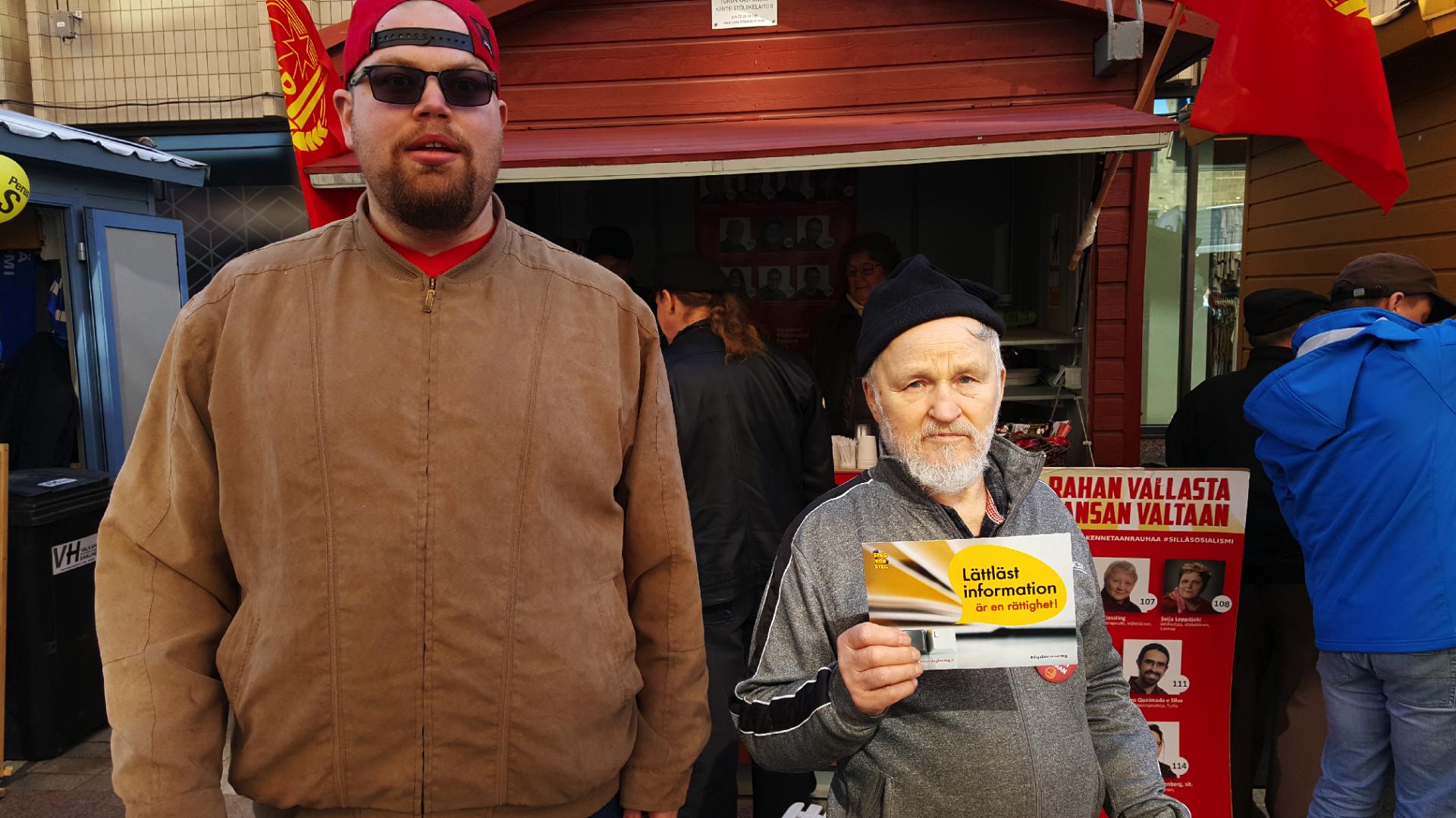 Martti Leppänen (SKP) stöder vår kampanj om att rätten till lättläst information ska skrivas in i lagen. Med på bilden är även Tero Määttä från Steg för Steg.